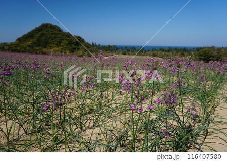 鳥取砂丘東側の畑に咲くらっきょうの花 Ver2