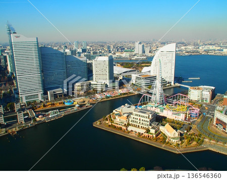 横浜市中区の山下公園(背景に横浜ランドマークタワー・大観覧車・横浜赤レンガ倉庫・大さん橋など)