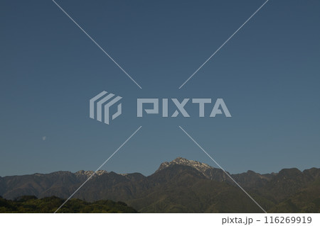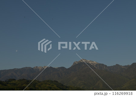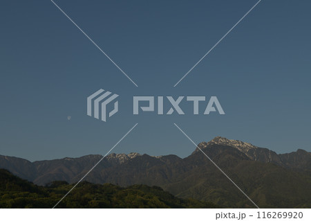 北杜市白州町、早朝の南アルプスと月齢19.4の月