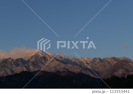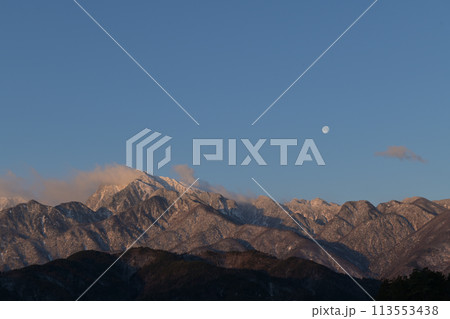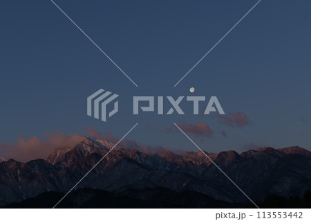 月齢16.2朝焼けの南アルプスの山並みに掛かる立待月