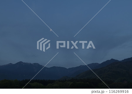 南アルプスの山並みに掛かる月