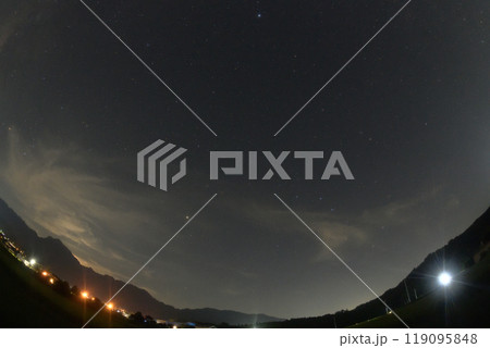 北杜市白州町、文月宵の空、山並みの上に掛かる春の大曲線