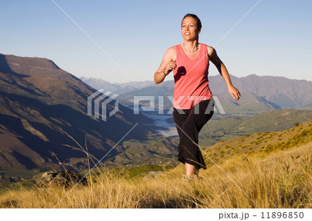Young Woman Jogging In The Wilderness With Mountain Range As A B