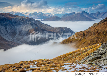 Stelvio pass, mountain dramatic landscape at dawn above mist, Italy