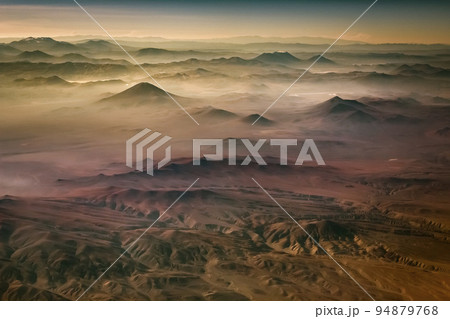 Aerial Atacama desert, snowcapped volcanoes and arid landscape in Chile