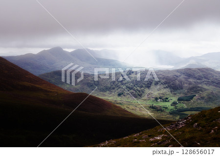 A wide angle view of a valley in County Kerry. Visible are the various mountains and hills on the Coomloughra Horseshoe, Ireland on a cloudy, overcast day, with low-lying clouds.