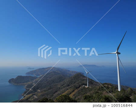 上関町「上盛山展望台」(展望台から風力発電風車と祝島)