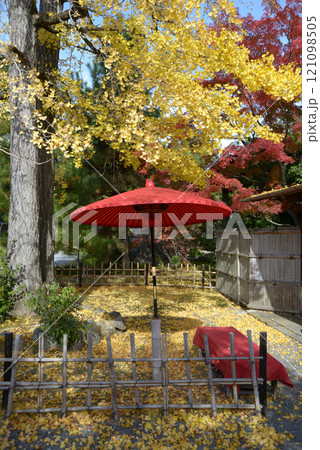 清涼寺 イチョウの黄葉と野点傘 京都市右京区嵯峨