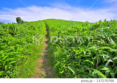 伊豆半島 夏の伊豆山稜線歩道 達磨山の山頂へ続く草原の道