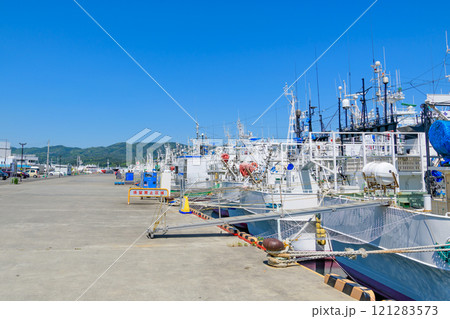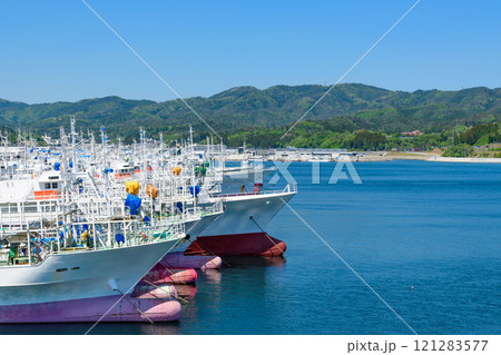 宮城県 気仙沼市 気仙沼湾 遊覧船から眺める係留岸壁の漁船と紅葉の安波山