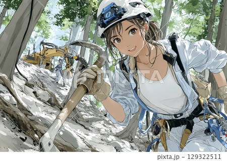登山道を整備する山岳警備隊の女性職員のイラスト素材