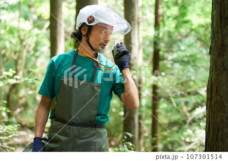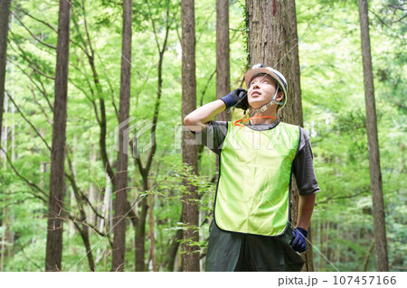 森にてトランシーバーで話すヘルメット着用の男性 森林官 自然保護官 イメージ