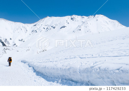 ぽつんと登山者と雄大な立山連峰立山連峰4月雪の多い立山黒部アルペンルート