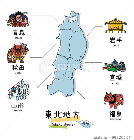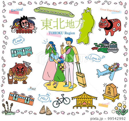 日本の東北地方の名所観光とマップ、アイコンのセット