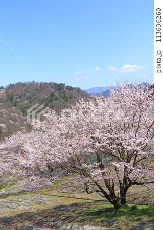 満開の尾所の桜と春の青空1 岡山県津山市