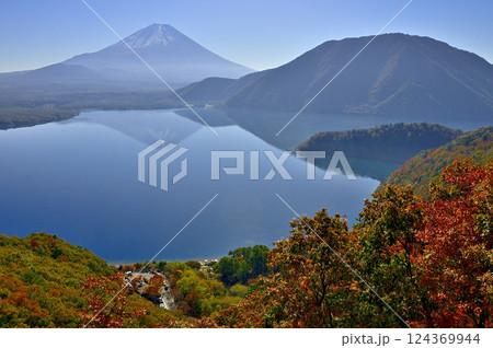 天子山地の中之倉峠展望台より望む富士山と紅葉の本栖湖に映る逆さ富士