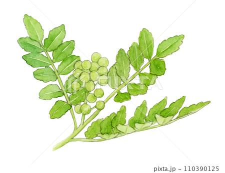 手描きの水彩で描いた山椒の葉と実のイラスト