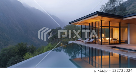 Luxurious mountain retreat at dusk with stunning views and serene ambiance overlooking the natural landscape. Generative AI