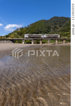 宮崎県日南市細田川河口から広がる日南海岸大堂津海水浴場とJR九州日南線橋梁を走る通勤列車のキハ40