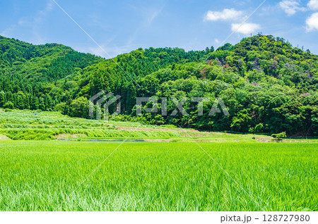 湖北地方西浅井町の山田と針葉樹林風景 滋賀県長浜市