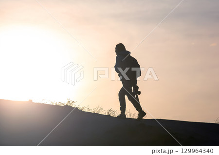 Silhouette of a person walking towards the sunset on a hilly terrain