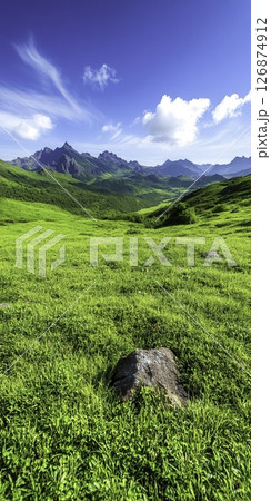 Vast green grass field and majestic mountains under clouds