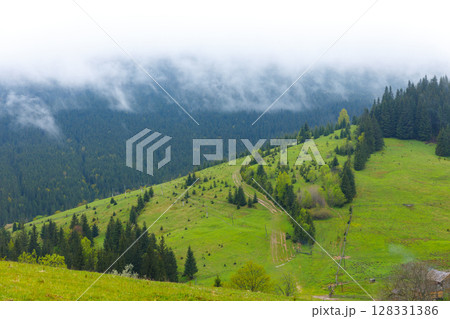 Serene Mountain Landscape with Lush Green Hills and Misty Clouds Above in a Peaceful Natural Setting in Early Spring