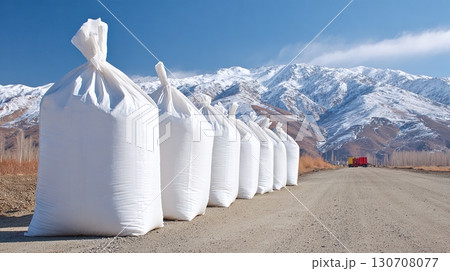 A row of large white sacks sits on a dirt road under a sunny sky, with snow-covered mountains in the background. The sacks appear to be made of woven polypropylene.