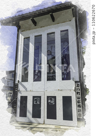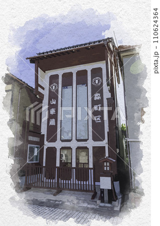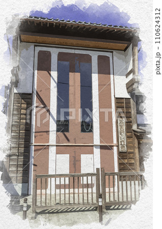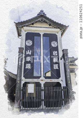 水彩画風 三国湊 三國神社門前の岩崎区山車蔵 福井県坂井市