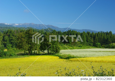 快晴の飯豊連峰を背景に輝く喜多方市山都町の稲穂と蕎麦畑