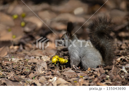 早春の森と可愛いエゾリス