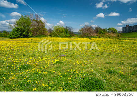 タンポポ咲き乱れる春の野原とわた雲浮かぶ空