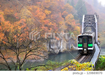 只見線「雨降る第四只見川橋梁を走る列車」紅葉背景に