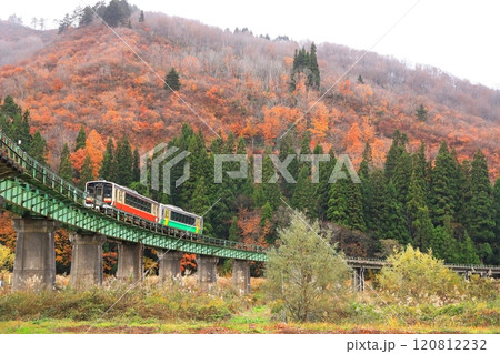 只見線「叶津川橋梁を走る列車」紅葉した山を背景に