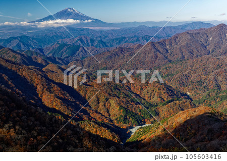 丹沢山地・塔ノ岳から見る紅葉の山並みと富士山