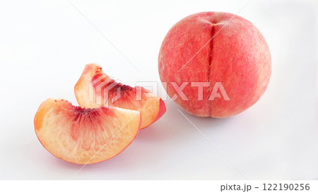 おいしそうに完熟した白桃1個とカット断面、夏が旬の果物のイメージ