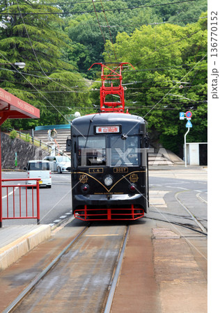 岡山市の東山おかでんチャギントミュージアム駅に停車する路面電車