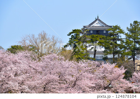 春の青空に映えるからくり時計・桜・岡崎城[岡崎城公園/愛知県岡崎市]