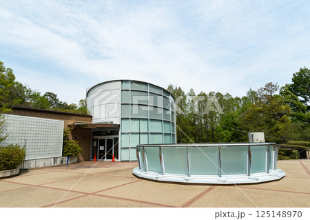 川崎市岡本太郎美術館の入口と吹き抜け開口部 春の青空 神奈川県川崎市多摩区