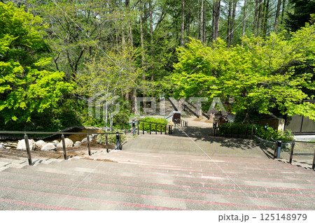 川崎市岡本太郎美術館の東側 階段と川が並走 春の青空 神奈川県川崎市多摩区
