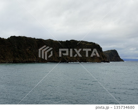 伊豆大島の岡田港と防波堤をフェリー船上から眺めた港の風景