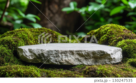 苔むした岩の台座:緑の森に溶け込む自然のディスプレイ