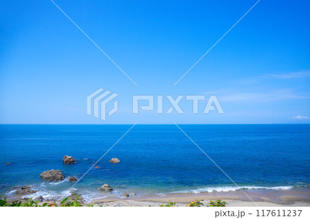 冬の快晴の青空と青い日本海と瀬波温泉海岸
