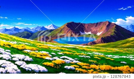 夏の高山植物が咲き乱れる高原の残雪が残るカルデラ湖の水彩画