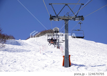 快晴のスキー場 頂上へ続くリフトと急斜面のゲレンデ