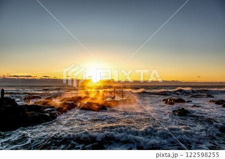 炎のように波と岩場が燃える荒波の神磯日の出風景