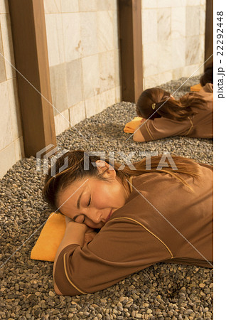岩盤浴でリラックスするミセス