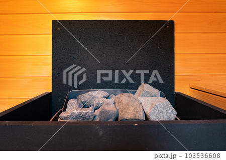 お洒落なプライベートドライサウナのサウナルームで熱せられた岩・石・ホットストーンのアップ(東京都)