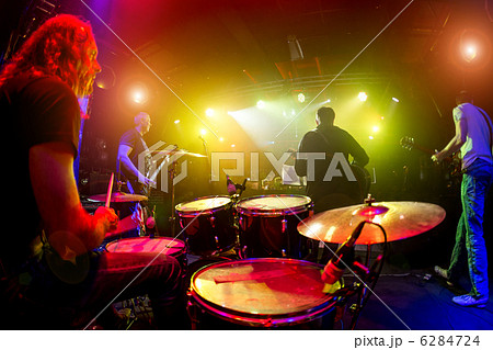 silhouette of pop rock band playing at musical festival on stage, guitarists and singer, illuminated background