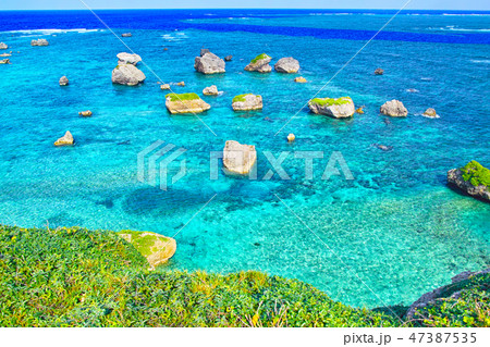沖縄県宮古島。熱帯植物と真夏の東平安名崎の風景